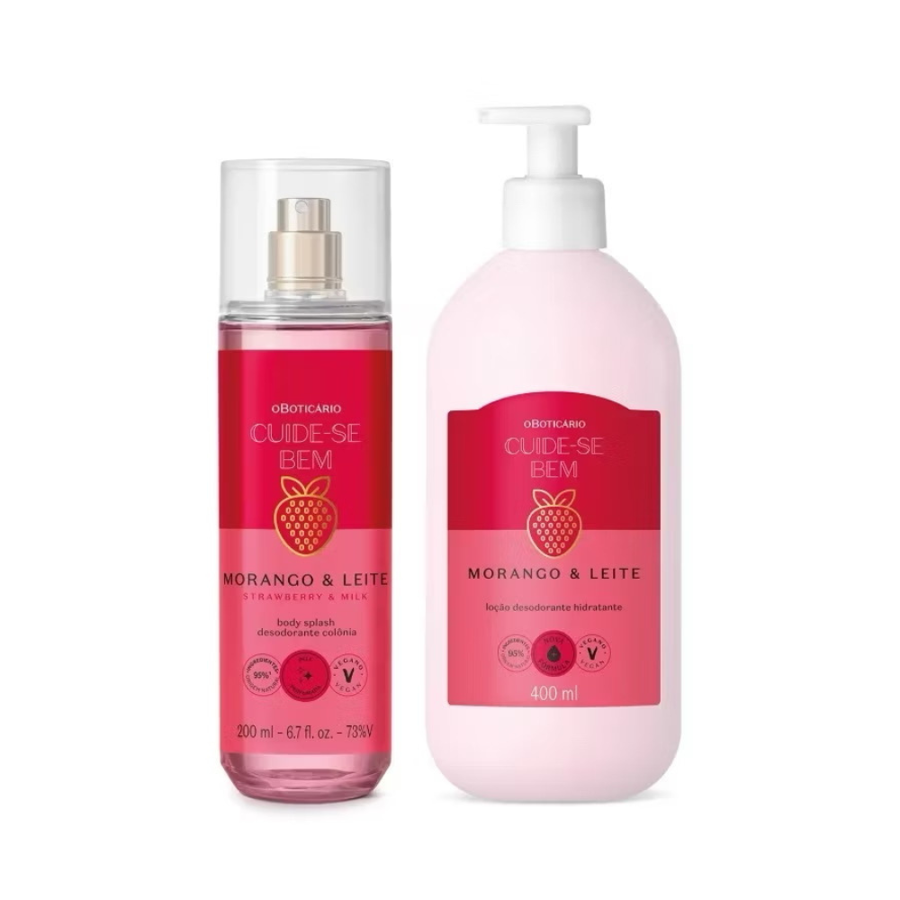 Loção Corporal: Nossa queridinha, a Loção Hidratante Desodorante Corporal Cuide-se Bem Morango e Leite, está de volta com a mesma fragrância deliciosa. Sua textura rosa absorve rapidamente, oferecendo até 48 horas de hidratação. Com extrato de morango e leite vegetal, possui 95% de ingredientes naturais para cuidar da sua pele.